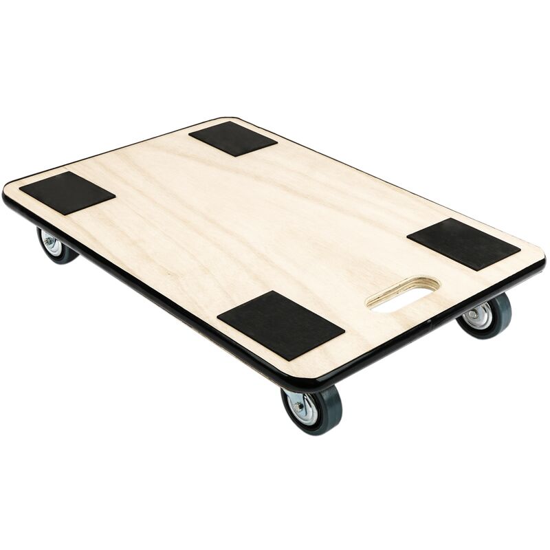 Piattaforma in legno a quattro ruote predisposta per il trasporto o lo stoccaggio di merce imballata. Ha un foro nella base per una migliore presa durante il trasporto di oggetti e scatole. Caratteristiche del prodotto: DATI TECNICI: Piattaforma con ruote per movimentare qualsiasi tipo di prodotto. Inoltre, ha quattro inserti in neoprene nero antiscivolo che fissano la merce impedendone la caduta. MATERIALI: realizzati in compensato antiurto di alta qualità, perfetto per sostenere carichi pesanti. Lo spessore del legno è di 17 mm. RUOTE: La piattaforma ha 4 ruote in nylon con un diametro di 72 mm che si adattano a qualsiasi pavimento. CAPACITÀ: L'articolo è in grado di supportare fino a 200 kg di livelli di carico. MISURE: La dimensione totale della piattaforma è di 600 mm di larghezza, 400 mm di lunghezza e 110 mm di altezza.