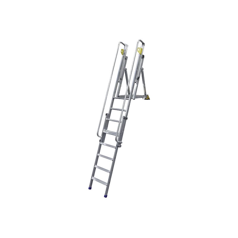 Struttura in alluminio, assemblaggio con saldatura. - Montanti telescopici su 5 altezze predefinite. - Aggiustamento con precisione del sistema anti-ribaltamento per profondità da 1.13m a 2.30m. - Accesso tramite gradini antisdrucciolo profondi 80mm. Doppio corrimano. - Dispositivo anti-ribaltamento, composto da una pedana di accesso antisdrucciolo e di 2 suole articolate per superfice irregolare. L'insieme è pieghevole per un trasporto facile. 2 punti per sollevamento tramite gru. - Suole di appoggio dotate di fori per fissare nel suolo. - Numero di gradini: 10.
