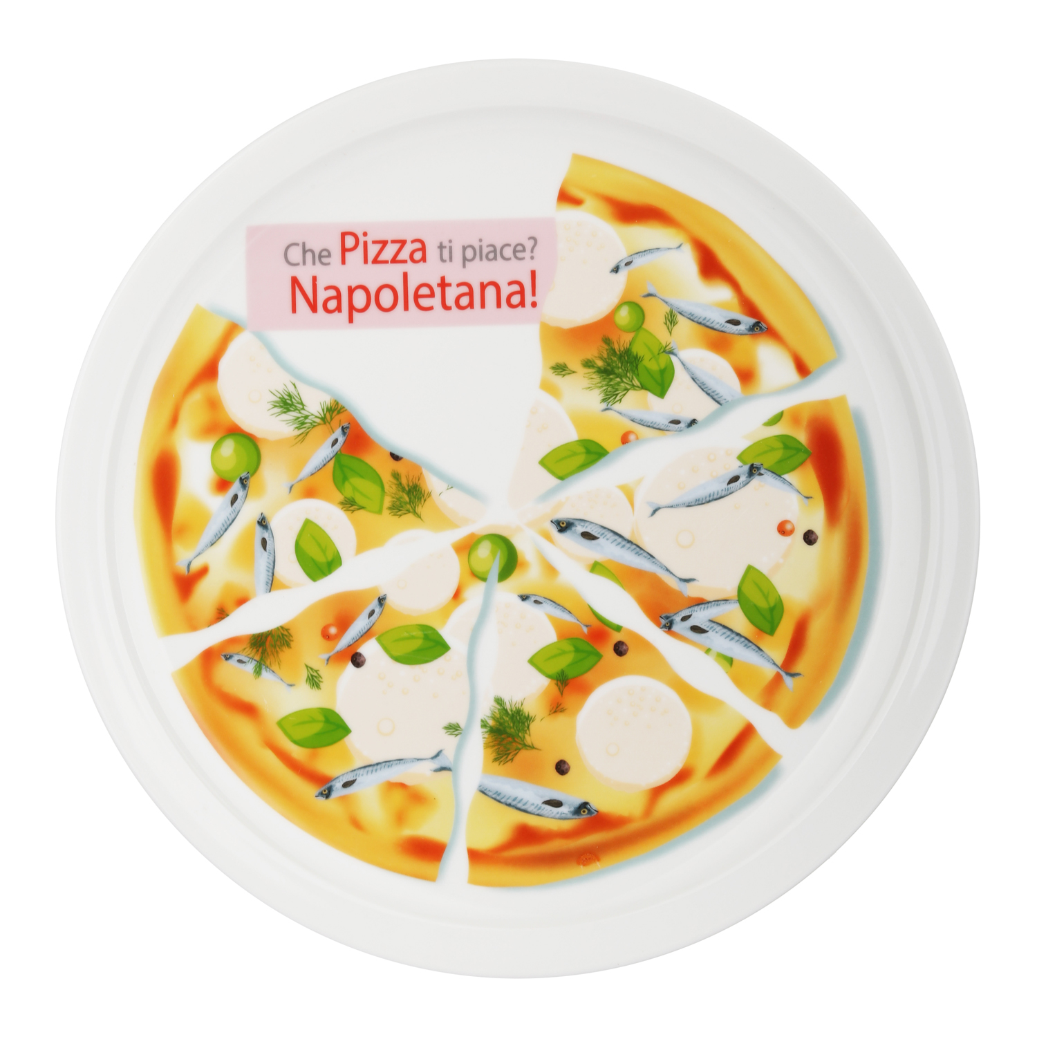 Il piatto per pizza Napoletana è l'ideale per servire le tue pizze fatte in casa o gustose focacce in modo divertente e originale, sorprendendo gli ospiti che, fetta dopo fetta, scopriranno il decoro. In 100% porcellana, il piatto è lavabile in lavastoviglie e utilizzabili in forno e microonde. Abbinalo agli altri piatti della linea per un servizio completo. Diametro: 30,5 cm.