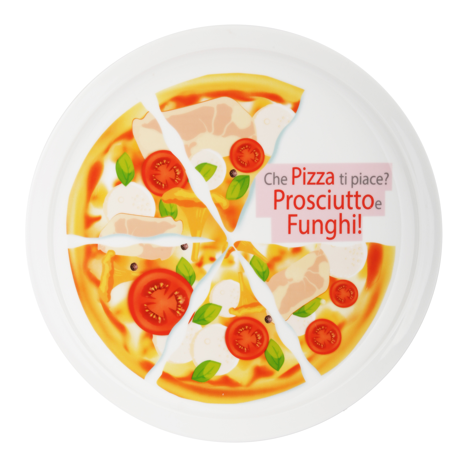 Il piatto per pizza Prosciutto e funghi è l'ideale per servire le tue pizze fatte in casa o gustose focacce in modo divertente e originale, sorprendendo gli ospiti che, fetta dopo fetta, scopriranno il decoro. In 100% porcellana, il piatto è lavabile in lavastoviglie e utilizzabili in forno e microonde. Abbinalo agli altri piatti della linea per un servizio completo. Diametro: 30,5 cm.