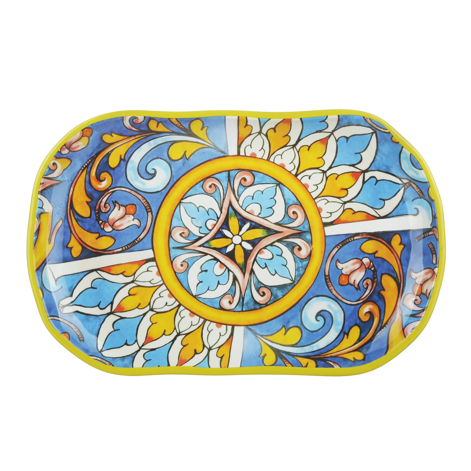 Il piatto Portocervo è realizzato in melammina di alta qualità, famosa per la sua resistenza e longevità. Questo piatto presenta un vivace e gioioso design ispirato ai motivi tradizionali mediterranei, con un bordo giallo che circonda un affascinante motivo centrale caratterizzato da forme geometriche e floreali nei toni del blu, giallo e arancione. Ideale per portare un tocco di raffinatezza alla tua tavola, il piatto Portocervo è perfetto per l'uso quotidiano e rende unici i momenti conviviali all'aria aperta. La melammina infatti, rende piatti e stoviglie leggeri, ideali per il cestino da picnic, e resistenti agli urti, quindi totalmente sicuri anche per i bambini. Inoltre, questo piatto è lavabile in lavastoviglie per una pulizia pratica e veloce.