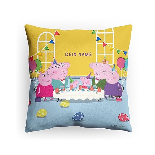PICANOVA - Peppa Pig e compleanno in famiglia Cuscino con Nome 40x40cm - Cuscino Personalizzato per Bambini - Cuscino Decorativo con Imbottitura e Federa - Cuscino con Cane Cartone Animato