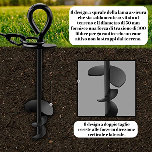 Picchetti per il terreno per impieghi gravosi: Realizzato in metallo massiccio con rivestimento nero per evitare la ruggine. I pali di 15 mm di spessore sono sufficientemente robusti per cani di piccola e grande taglia fino a 125 libbre. L'ampia pala a spirale si avvita facilmente al terreno con il palo, così non dovrete preoccuparvi che il vostro cane estragga il picchetto da terra. Impedisce al cane di fuggire dal giardino, pur lasciandogli molto spazio.