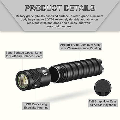 PICCOLO E FACILE: il case è realizzato in lega di alluminio, robusto e robusto, anche molto facile da trasportare e impugnare, solo 66 * 14,5 mm, 12 grammi (senza batteria). Grazie al portachiavi puoi insegnare la mini luce ovunque. L'o-ring fluorescente e il diffusore opzionale facilitano la ricerca di torce al buio.