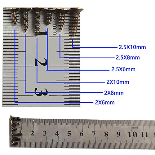 Scatola di classificazione della vite: 2X6mm / 2X8mm / 2X10mm / 2.5X6mm / 2.5X8mm / 2.5X10mm, ogni 200PCS, un totale di 6 generi di 1200PCS. Colore: Bronzo, materiale: ferro Le viti sono molto piccole, in millimetri, si prega di acquistare con attenzione (1 mm = 0,0393701 pollici)