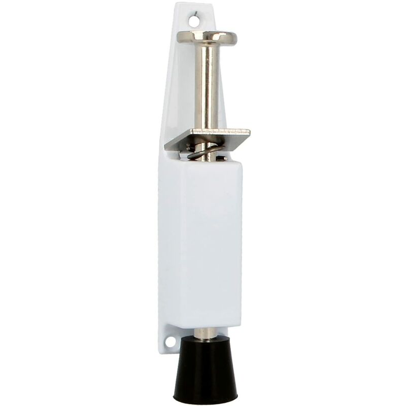 Supporto verticale per porte con ampio piede in gomma antiscivolo. Realizzato in zama con finitura bianca. Dimensioni: 120 x 25 mm. Corsa: 28 mm Include viti per il fissaggio. Questo fermaporta mantiene la porta aperta ed evita l'apertura o la chiusura accidentali a causa di correnti d'aria che possono causare danni o scheggiature al telaio della porta o alla parete. Ideale per case, porte di comunità, uffici, negozi, ristoranti, hotel o altri stabilimenti commerciali.