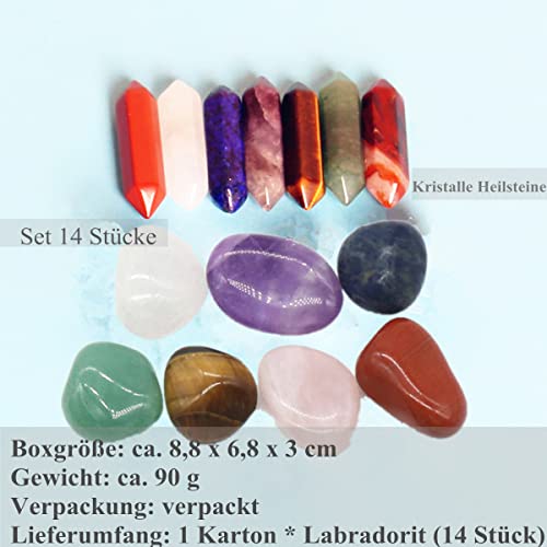 Pietre Energetiche per la Meditazione: 2 x quarzo trasparente, 2 x ametista, 2 x quarzo rosa, 2 x turchese, 2 x occhio di tigre, 2 x lapislazzuli, 2 x diaspro rosso, totale 14 pezzi di cristalli curativi. Posizioniamo queste pietre nell'ordine dei chakra. L'ordine e il colore sono indicati per voi nell'immagine. Se si desidera rafforzare solo un determinato chakra, è possibile utilizzare le perline del colore corrispondente anche come ciondolo da indossare.