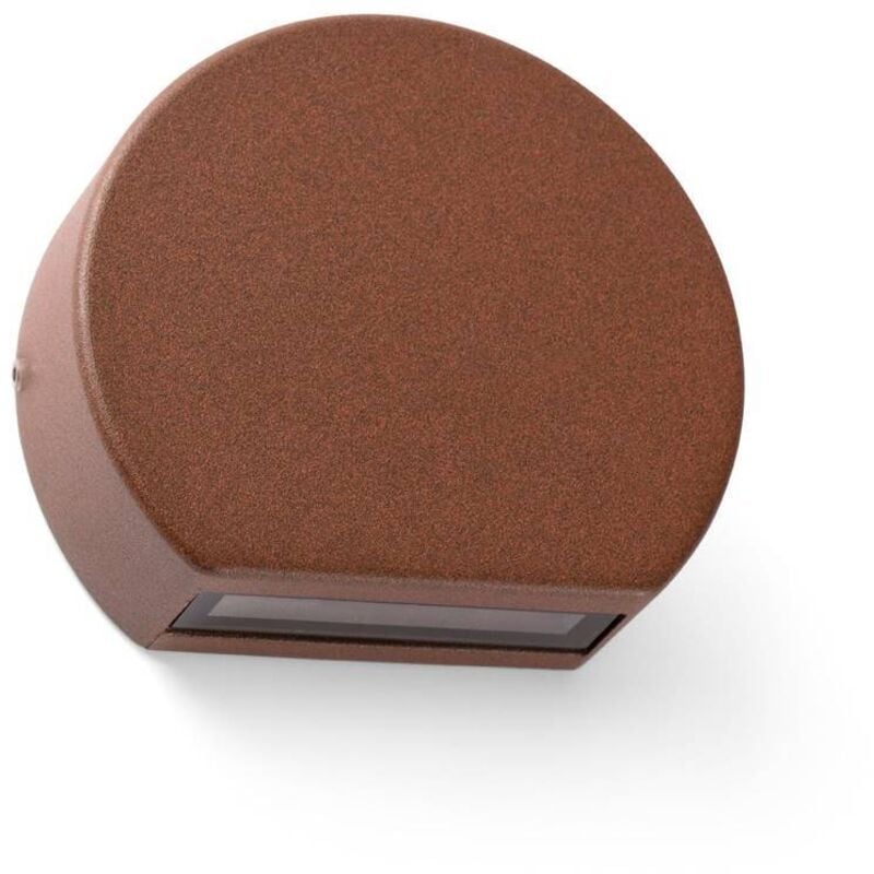 Aplique para exterior marrón oxido, modelo PILL de FARO. Se puede fijar en pared. La fuente de luz incluida es COB LED 3,5W 3000K 110Lm. Fabricado en aluminio y acabado en marrón oxido. Dispone de una protección IP54