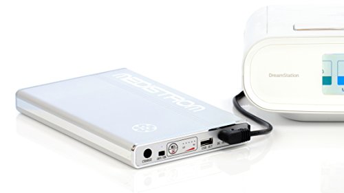 9 x 12 x 2 cm, 0,82 kg (1,8 lb) 12 - 15 V per CPAP, 5 V per la porta USB, mantiene circa Due notti senza umidificatore, a seconda della pressione e della regolazione del dispositivo, tempo di ricarica da 3 a 4 ore.