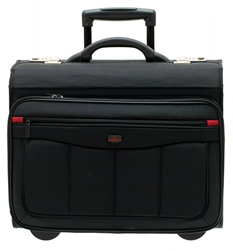'Pilot Case in nylon trolley. Colori Nero, interno rosso. Ideale per trasportare dei cartelle voluminosi. 1 grande scomparto interno con pratica apertura sul superiore dotato di una tasca imbottita con separazione rimovibile per notebook 17 e una tasca a soffietto per documenti. 2 tasche con zip sul davanti di cui una con un organizzatore con 3 scomparti e delle tasche multirangement. 2 serrature a combinazione, Maniglia di trasporto telescopica, ruote silenziose. Dimensioni