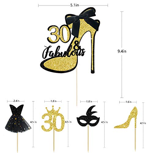 IL PACCHETTO COMPRENDE: 30 e favolose decorazioni per feste Il kit per topper per torte e cupcake comprende 32 topper per cupcake con ricchi elementi femminili e 1 grande topper per torte 30 e favolosi in un unico tacco alto con una bellissima forma a fiocco in raso.