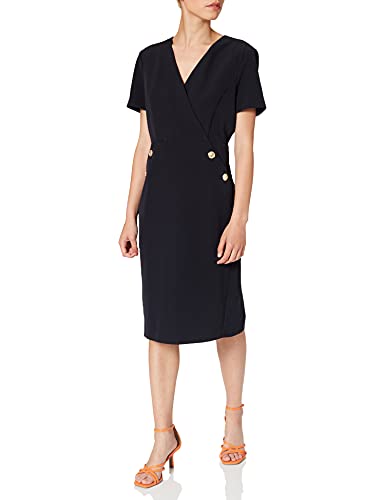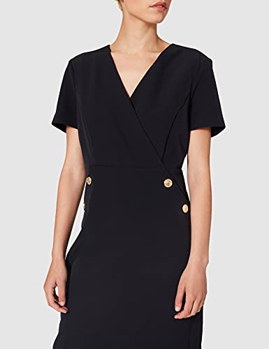 Abito in tessuto tecnico stretch con maniche corte e scollo a V incrociato davanti e gonna longuette con bottoni dorati in metallo sui fianchi. Chiusura con zip invisibile nel centro dietro.