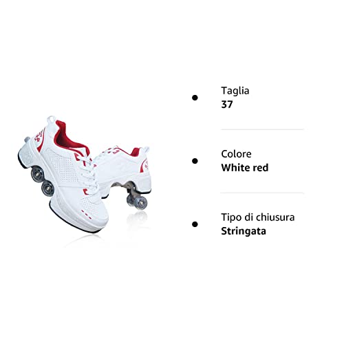 Pinkskattings@ Pattini A Rotelle Scarpe da Skate per Donna Uomo Ragazzi Scarpe per Scarpe da Ginnastica A Rotelle Retrattile 4 Ruote Skateboard Kick Roller Shoes (White Red, 35)