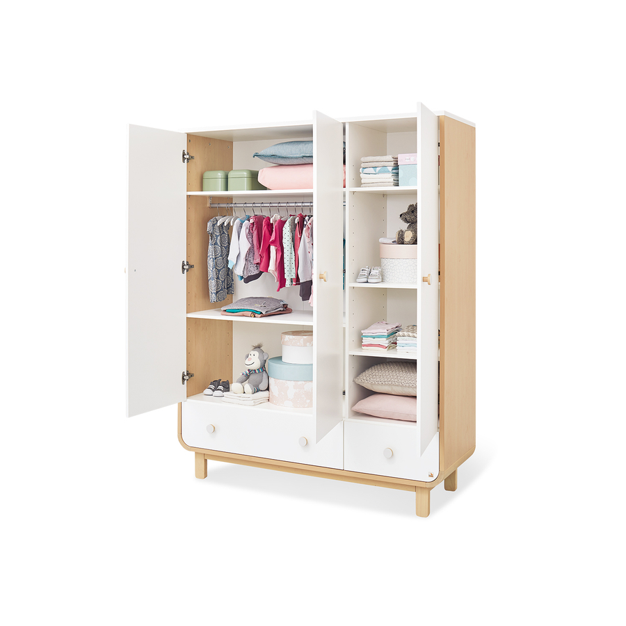 Sviluppato, testato, e commercializzato con grande attenzione ai dettagli, Pinolino offre un assortimento di alta qualità di mobili, giocattoli e accessori per bambini dal 1997. Pinolino è sinonimo di valori come famiglia, felicità e sicurezza. Mobile ideale per la camera dei bambini. Round è il mix perfetto tra design retrò di tendenza e influenze scandinave. Un grande armadio con chiusure morbide, 5 ripiani regolabili in altezza e 1 aste appendiabiti. L'armadio spazioso ha una chiusura soft-close, in modo che le ante si chiudano dolcemente e silenziosamente. Ulteriori ripiani sono disponibili separatamente. Dettagli del prodotto: Colore: bianco/legno naturale Materiale: compensato Materiale zoccolo: pino massello, verniciato in acero Dimensioni: Ampiezza x Lunghezza x Altezza 145 x 54 x 183 cm 3 ante 2 cassetti 1 asta appendiabiti orizzontale 5 ripiani regolabili in altezza Pomelli di alta qualità in acero massiccio Zoccoli di alta qualità in legno massello di pino, laccato in acero Inclusi nella spedizione: Armadio 5 ripiani regolabili in altezza 2 cassetti 1 asta appendiabiti orizzontale Attenzione: Le decorazioni NON sono incluse nella spedizione!