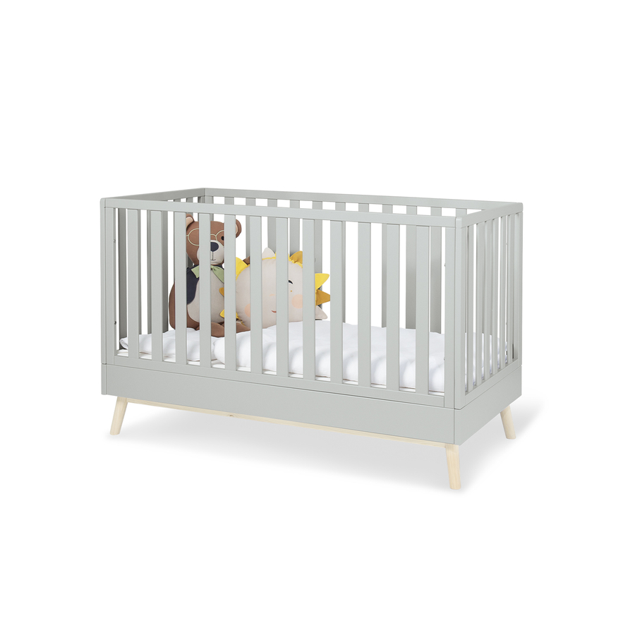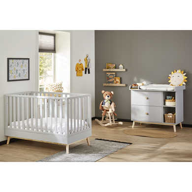 Dettagli del prodotto: Decoro: liscio, grigio e massiccio, pino chiaro, laccato Struttura in legno parzialmente visibile 2 pezzi Letto per bambini Dettagli del prodotto: 3 pioli a doghe Rete a doghe regolabile in altezza in 3 posizioni: da 24 a 40 e 60 cm Trasformabile in letto Junior e in divano per bambini, 2 angoli di conversione e 2 sponde di conversione incluse Base di alta qualità tiger in legno di pino massiccio Dimensioni e peso: Dimensioni del materasso: larghezza x lunghezza 70 x 140 cm Dimensioni: larghezza x lunghezza x altezza 75 x 145 x 94 cm Materiale e cura: Materiale: Pannello piatto pressato, laccato Materiale della base: Pino massiccio, laccato Unità di cambio Dettagli del prodotto: 2 cassetti 2 scomparti aperti Fasciatoio con 3 scomparti;
