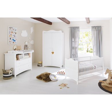 Sviluppato, testato, e commercializzato con grande attenzione ai dettagli, Pinolino offre un assortimento di alta qualità di mobili, giocattoli e accessori per bambini dal 1997. Pinolino è sinonimo di valori come famiglia, felicità e sicurezza. Con il suo design elegante, la linea Florentina crea un ambiente accogliente nella cameretta dei bambini. Per chi cerca una cameretta funzionale e alla moda. Composta da 3 pezzi: lettino per bambini con doghe e pannelli laterali, fasciatoio XL con base per il cambio rimovibile e armadio a 2 ante con 3 ripiani regolabili in altezza e 1 asta appendiabiti. La collezione Florentina è disponibile come cameretta completa o mobili singoli. Il mobile fasciatoio è disponibile con o senza la mensola. La mensola si può acquistare anche separatamente. I pomelli sono disponibili in tre colorazioni: bianco, rosa e menta. Dettagli del prodotto: Lettino Colore: bianco Materiale struttura: legno truciolato, rivestito di melammina Materiale sbarre: Pino massello, laccato Superficie di riposo: Larghezza x Lunghezza 70 x 140 cm Dimensioni: Ampiezza x Lunghezza x Altezza 76 x 146 x 87 cm Doghe regolabili in 3 altezze 16 / 32 / 48 cm 3 sbarre staccabili Convertibile in letto junior Incluse sbarre laterali per trasformazione in letto junior Mobile fasciatoio Colore: bianco Materiale: legno truciolato, melaminico Dimensioni: Ampiezza x Lunghezza x Altezza 130 x 57 x 101 cm Misure con base fasciatoio: Ampiezza x Lunghezza x Altezza 130 x 77 x 101 cm Altezza fasciatoio: 93 cm Superficie per il cambio removibile 2 cassetti 2 sezioni aperte Set pomelli in graziosi colori pastello Armadio Colore: bianco Materiale: legno truciolato, melaminico Dimensioni: Ampiezza x Lunghezza x Altezza 98 x 58 x 180 cm Altezza da terra: 9 cm 2 ante 1 asta orizzontale 3 mensole regolabili in altezza Set di pomelli in colori di tendenza per personalizzare la cameretta (bianco, rosa e menta) Inclusi nella spedizione: Lettino Rete a doghe in legno Pannelli laterali per trasfo
