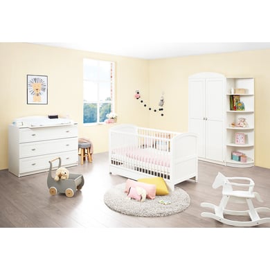 Sviluppato, testato, e commercializzato con grande attenzione ai dettagli, Pinolino offre un assortimento di alta qualità di mobili, giocattoli e accessori per bambini dal 1997. Pinolino è sinonimo di valori come famiglia, felicità e sicurezza. Cameretta romantica a 3 pezzi: composta da lettino per bambini con pannelli laterali di trasformazione, ampio fasciatoio con base per il cambio rimovibile e armadio a 2 ante con mensole. Dettagli del prodotto: Lettino Colore: bianco Materiale letto: legno truciolato, rivestito di melammina Materiale sbarre: Pino massello, laccato Superficie di riposo: Larghezza x lunghezza 70 x 140 cm Dimensioni: Ampiezza x Lunghezza x Altezza 75 x 143 x 90 cm 3 sbarre staccabili Rete regolabile in altezza da 15 cm a 31 cm e 46 cm Convertibile in letto junior Inclusi i lati di conversione Mobile fasciatoio Colore: bianco Materiale: MDF Misure senza base fasciatoio: Ampiezza x Lunghezza x Altezza 120 x 55 x 101 cm Altezza fasciatoio: 89 cm Base per il cambio removibile 3 cassetti, di cui 1 con sezione biancheria 1 mensola Armadio Colore: bianco Materiale: MDF Dimensioni: Ampiezza x Lunghezza x Altezza 91 x 57 x 192 cm 2 ante 6 ripiani 1 asta appendiabiti orizzontale Incluse nella confezione: Lettino Pannelli laterali per trasformare la culla in un letto junior Mobile fasciatoio Superficie per il cambio Armadio Base d´appoggio Asta appendiabiti Attenzione: Materasso e decorazioni NON sono inclusi nella spedizione!