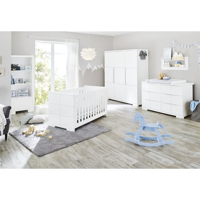 Pinolino sviluppa e realizza dal 1997 un'ampia gamma di mobili per bambini, accessori e giocattoli. Vasta gamma di assortimento nei tre stabilimenti. La combinazione vincente degli articoli, il buon servizio assistenza clienti ed i prezzi convenienti fanno di Pinolino il giusto Partner. L'ambizioso obiettivo della società è quello di ottenere la massima soddisfazione a tutti i livelli. Materiale di alta qualità, precisione e la passione nei dettagli rendono Pinolino uno specialista nei mobili. Minimal La cameretta comprende una culla, un ampio mobile fasciatoio e un armadio a tre ante. Finish opaco e linee definite. Uno stile sempre attuale. Dettagli del prodotto: Lettino: Colore: bianco opaco Materiale: Pannello di fibra a media densità, verniciato Superficie di riposo: Larghezza x Lunghezza 70 x 140 cm Dimensioni: Ampiezza x Lunghezza x Altezza 76 x 148 x 82 cm 3 sbarre del lettino staccabili Rete regolabile in altezza da 13 cm a 25 cm e 43 cm Trasformabile in lettino junior o divano letto Peso: 60 kg Cura: Panno umido e strofinare con panno asciutto Fasciatoio: Colore: bianco opaco Materiale: Pannello di fibra a media densità, verniciato Materiale maniglie: Alluminio Misure senza base fasciatoio: Ampiezza x Altezza x Profonditá 140 x 98 x 55 cm Dimensioni: Ampiezza x Altezza x Profonditá 140 x 98 x 78 cm Altezza fasciatoio: 91 cm 6 cassetti con funzione Self-Soft-Close La base fasciatoio può essere montata a destra o a sinistra indistintamente. Base per il cambio removibile 3 pannelli di sicurezza Armadio a 3 Ante: Colore: bianco opaco Materiale: Pannello di fibra a media densità, verniciato Materiale maniglie: Alluminio Dimensioni: Ampiezza x Lunghezza x Altezza 167 x 57 x 182 cm 3 ante con chiusura soft-close 1 asta appendiabiti orizzontale 6 ripiani regolabili in altezza Inclusi nella spedizione: Lettino Pannelli laterali per trasformare la culla in un letto junior Mobile fasciatoio Armadio a 3 ante Attenzione: La mensola, il materasso e le decorazioni NON son