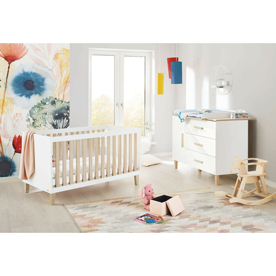 49 cm e 63 cm Piedi di alta qualità in legno massiccio di quercia Dimensioni e peso: Superficie di riposo: larghezza x lunghezza 70 x 140 cm Dimensioni: larghezza x lunghezza x altezza 77 x 145 x 84 cm Capacità di carico: max. 30 kg Distanza dal pavimento: 15 cm Materiale e cura: Materiale letto: MDF, laccato Materiale piedi: rovere massiccio, laccato Pulire con un panno pulito e umido Mobile fasciatoio extra largo Dettagli del prodotto: Colore: bianco / legno Il fasciatoio è rimovibile Il fasciatoio può essere montato a sinistra, al centro o a destra, come desiderato 1 anta 3 cassetti I cassetti possono essere montati a sinistra o a destra, come desiderato 1 ripiano regolabile in altezza Chiusura automatica e soft close Piedi di alta qualità in legno massiccio di quercia Dimensioni e peso: Dimensioni con fasciatoio: larghezza x profondità x altezza 136 x 77 x 101 cm Dimensioni senza fasciatoio: larghezza x profondità x altezza 136 x 56 x 101 cm Altezza per il cambio: 93 cm Materiale e cura: Materiale struttura: MDF, laccato Materiale piedi: rovere massiccio, laccato Pulire con un panno umido Incluso nella consegna: Culla Pannelli laterali di conversione Cassettiera extra larga Fasciatoio Attenzione: il materasso e la decorazione non sono inclusi.