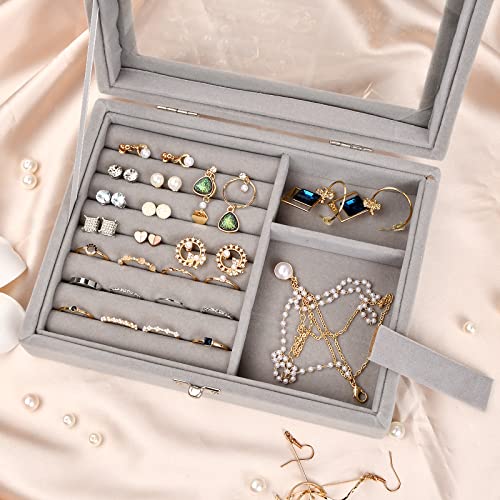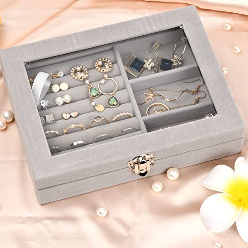 Pinsheng Scatola Portagioie Velluto, Grigio Cofanetto Portagioie con Coperchio in Vetro Organizzatore da Gioielleria Donna per Orecchino, Anello, Gemelli