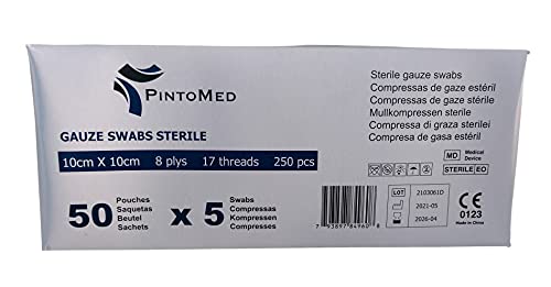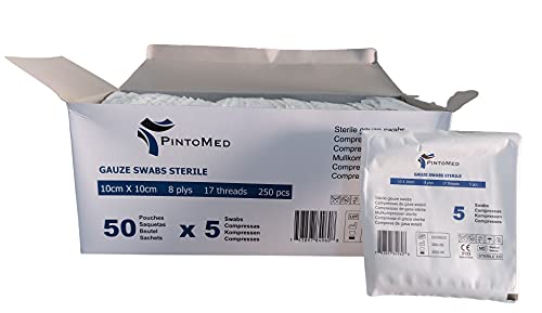 PintoMed Tamponi di Garza, Assorbenti di Garza, Sterili, 10 cm x 10 cm, 8 plys, scatola da 250 pezzi, 5 per sacchetto, 50 sacchetti