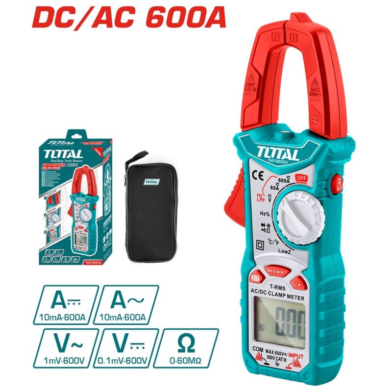 Corrente CC: 60 A/600 A ± (2,5% + 5) Servizio: 1%~99% ±(1,0%+2) Test diodi/Vero RMS/LPF Temperatura:-40°C~1000°C (-40°F~1832°F) ±(1,0%+2) Corrente CA: 6A/60A/600A/±(2,5% +8) Tensione CA: 600 V ± (0,8% +5) Tensione CC: 600 V ± (0,5% +3) Resistenza: 6kΩ/60kΩ ±(1,0% +3) Capacità: 10nF/100nF/1nF/10uF/100uF/1mF/10mF/100mF ±(4,0%+3) 6000 conteggi/conservazione dati Con funzione di indicazione di retroilluminazione/luce flash/batteria scarica Imballato da scatola di colore