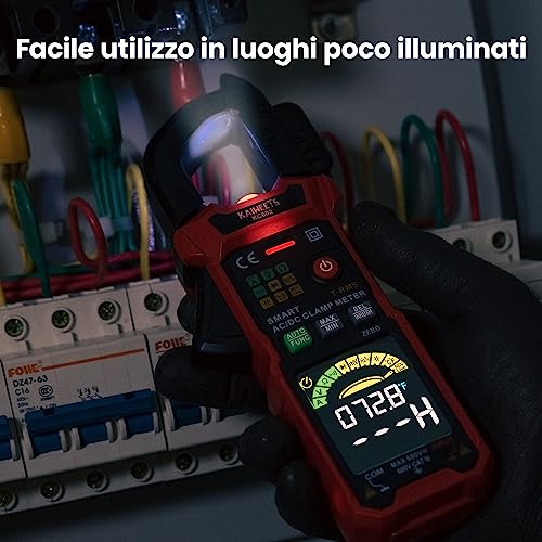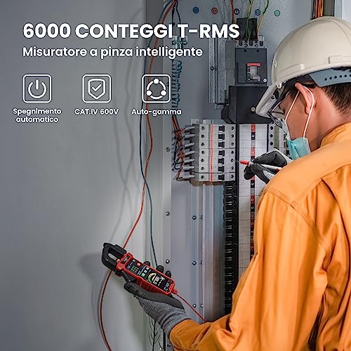 Pinza Amperometrica Intelligente KAIWEETS Multimetro a Pinza Automatica T-RMS 6000 Conta con Ganasce a D Forma, Funzione di Corrente di Spunto, Schermo a Colori HD, Misura Corrente/Tensione AC/DC, NCV