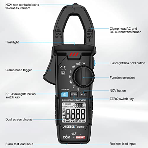 Pinza Amperometrica MESTEK Digitale Multimetro AC DC Professionale T-RMS Auto-Ranging 6000 conteggi Capacità Diodo NCV LoZ VFD