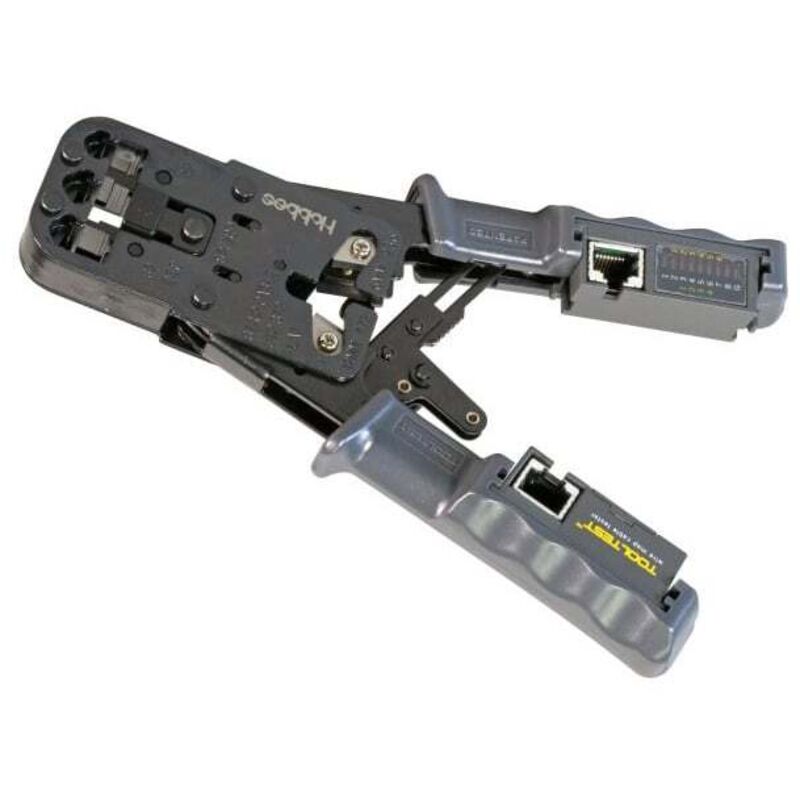 · Strumento innovativo che riunisce in un unico prodotto una pinza a crimpare, una pinza spelafili, una taglierina e un tester per cavi di rete · Questa combinazione lo rende il più comodo e innovativo strumento sul mercato, indispensabile per gli installatori · Permette di crimpare i seguenti plug modulari: 8P8C (RJ45), 6P6C (RJ12), 6P4C (RJ11) · Verifica del cavo per continuità, rotture, cortocircuito ed errori di cablaggio · Indicazione pin-to-pin · Dopo averlo acceso, lo strumento automaticamente avvia il programma di test e permette di visualizzare i risultati immediatamente sull impugnatura · Strumento innovativo che riunisce in un unico prodotto una pinza a crimpare, una pinza spelafili, un taglierino e un tester per cavi di rete · Questa combinazione lo rende il più comodo e innovativo strumento sul mercato, indispensabile per gli installatori · Consente agli installatori di eseguire rapidamente e facilmente la verifica del collegamento dei cavi di rete per controllare