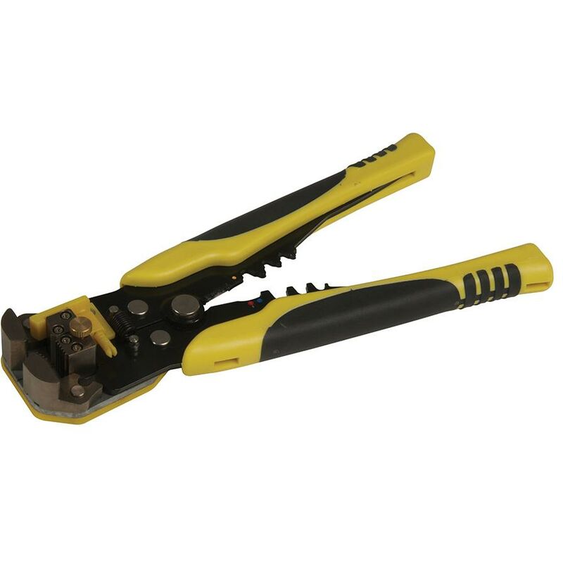 Pinza a crimpare spellacavi. Indicata per un utilizzo intensivo e compatibile con cavo circolari e piatti. Profondimetro integrato e vite di regolazione per una maggiore precisione. Indicata per cavi di 0,2-6 mm². Utile a crimpare terminali isolati di 1,5, 2,5 e 6 mm²;