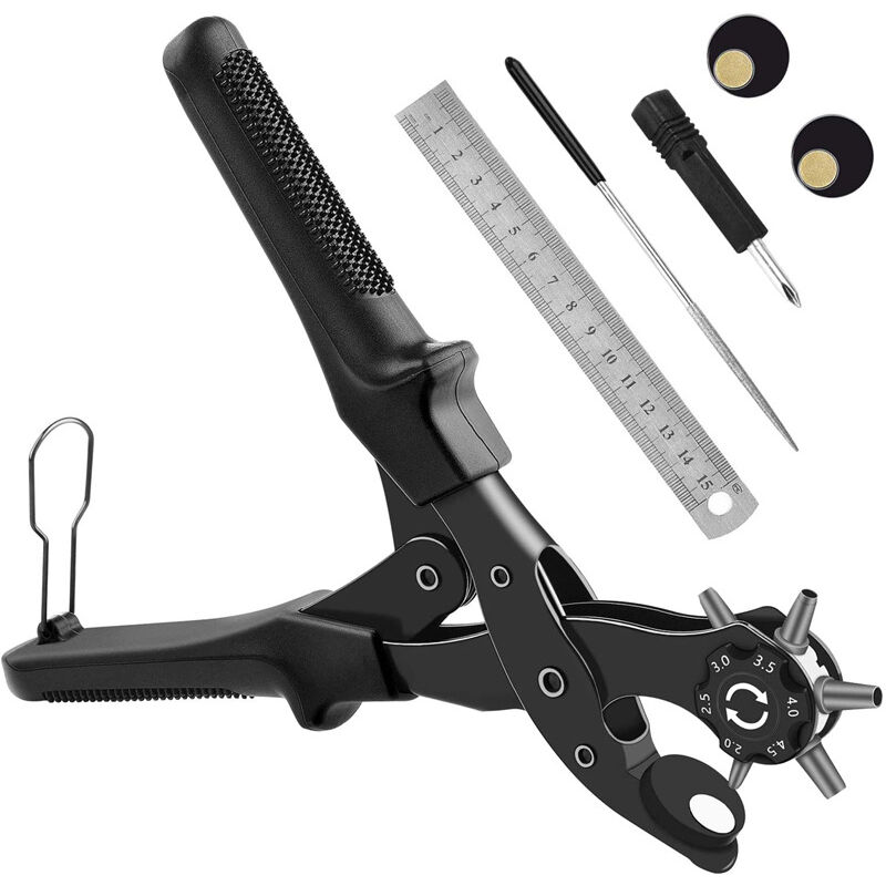 per praticare fori tondi su pelle, plastica, tela, tessuti, selle e materiali simili, particolarmente utile come punzonatrice per pelle 【Set completo perfetto [barra abrasiva aggiunta]】 Include 1 perforatore in pelle, 2 piastre di ricambio gratuite, 1 cacciavite, 1 righello e 1 bacchetta abrasiva. Il righello trasparente può misurare con precisione il tuo pezzo e un cacciavite può sostituire le piastre di ricambio e avvitare le viti sulla cintura. La testa del foro sarà opaca dopo un uso prolungato, l'asta di macinazione potrebbe rendere affilata la testa del foro. Può anche ripulire gli oggetti bloccati in casa.