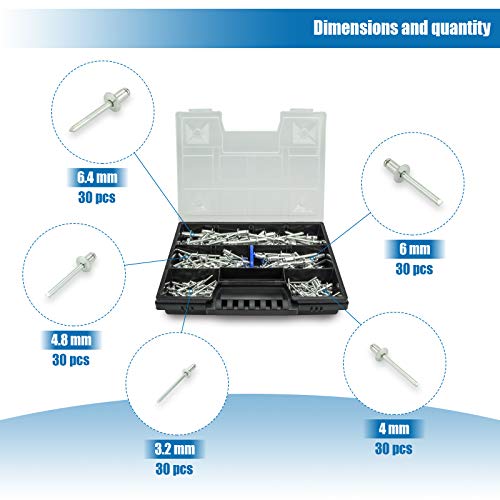 Pinza rivettatrice per rivetti ciechi 3,2 - 6,4 mm inclusi 150 rivetti in alluminio assortiti / valigetta