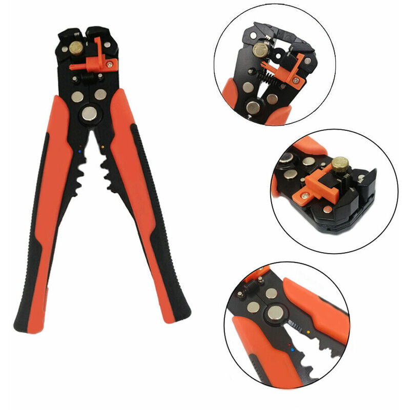 Pinza Spelafili: Realizzato in acciaio al manganese. Perfetto per uso industriale e quotidiano Pinze per spelatura filo 5 in 1, spelatura, taglio e crimpatura. La pinza dentata appositamente progettata e lavorata con precisione può afferrare saldamente e tagliare facilmente i fili (rame o di alluminio). Auto-regolazione: con ganasce autoregolanti ideali per cavi in rame e alluminio da AWG (0,2-6 MM). Manopola girevole microregolatrice a rotella per spellare il filo. Capacità universale: Ganasce in acciaio al manganese Presenta una super durezza (HRC36-42), adatta per il fili (0,2-6,0 mm). Terminali isolati da crimpare: Adatto per (0,2-6 mm Terminali non isolati: idonei per 12-10 AWG (4-6,0 mm) / 16-14 AWG (1,5-2,5 mm) / 22-18 AWG (0,5-1,0 mm): Adatto per 7 -8 mm Impugnatura comfort antiscivolo: Le impugnature touch offrono il massimo comfort e riducono l'affaticamento della mano. Impugnatura in plastica, offre la massima leva (PP e TPR) e un maggiore comfort rendendo la presa