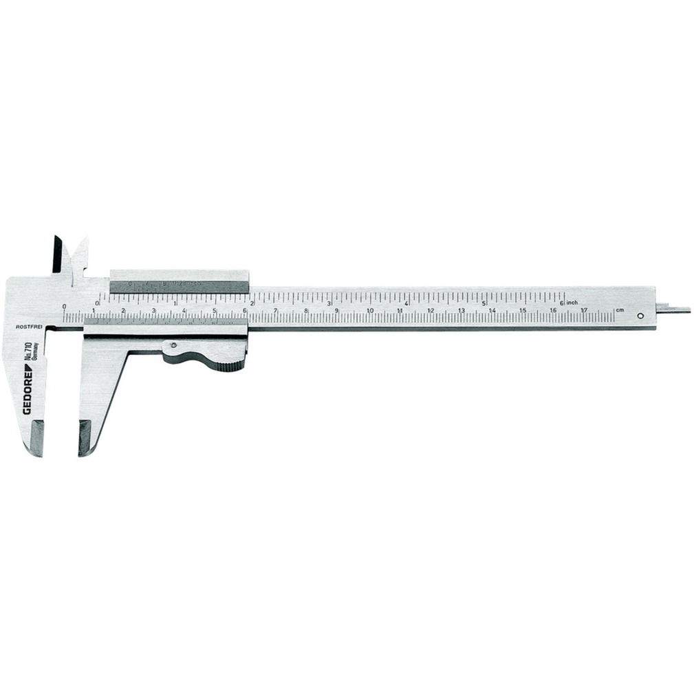 La pinza tascabile 710 di GEDORE è dotata di scala con millimetri e divisione pollici, Nonius 1/20 e 1/128". La pinza con becco incrociato, estremità del becco rettificato, misurazione della profondità e rilevamento della coppia è adatta per misurazioni esterne e interne da 0 a 140 mm, nonché per misurazioni di profondità. I valori misurati possono essere fissati mediante una vite di bloccaggio. Sul retro c''è una tabella di filettatura. La pinza tascabile 710 è dotata di una custodia in pelle.