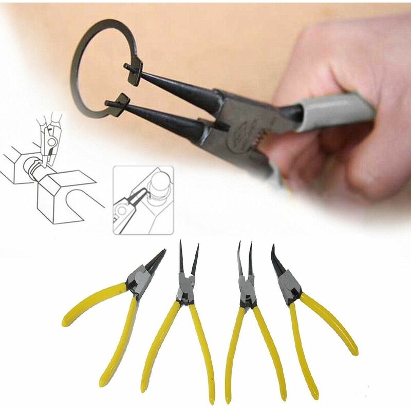 Pratico set di 4 piccole pinze circolari per anelli elastici con becco diritto e curvo, adatte sia per lavori professionali sia per il bricolage ed il fai da te. 4 pinze diverse per 4 utilizzi differenti. Ideale da avere nel proprio set di attrezzi sia esso set professionale o set per il fai da te. Pinze per anelli elastici interni ed esterni. Set costituito da 2 pinze a punta dritta di 170 mm 2 pinze con punta angolo 90�� di 170mm.