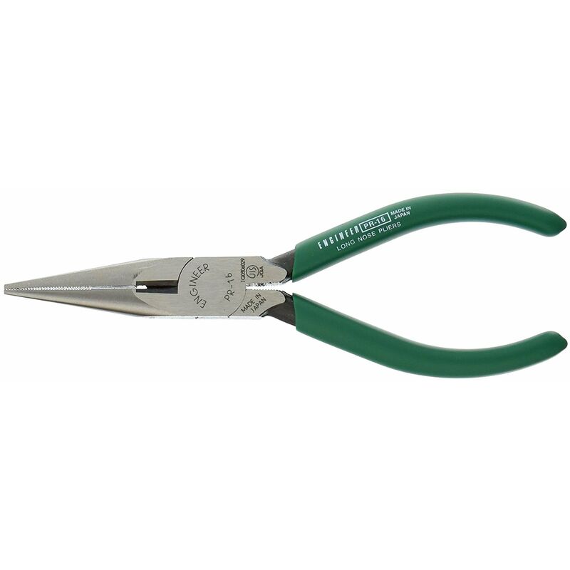 Descrizione Pinze a becchi lunghi di grado professionale (150 mm nominali) realizzate da un produttore giapponese di utensili manuali di precisione di lunga data e molto apprezzato. Queste pinze hanno ganasce seghettate per una presa salda, con ganasce di taglio integrate per tagliare filo di rame e acciaio.