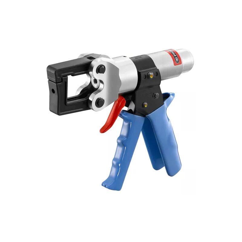 Dettagli: 35 kN. Corsa regolabile da 5 a 8 mm mediante rotazione dell'anello dentato che riduce il numero di corse della pompa per le sezioni più piccole. Testa rotante a 360°. Rilascio automatico con scatto acustico a fine crimpatura. Ritorno del pistone tramite leva di scarico. Consegnata in una scatola.