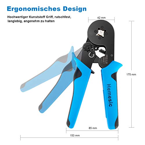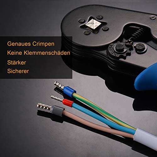 Cricchetto di regolazione della pressione facile da usare, in base alle esigenze del morsetto, si regola automaticamente al diametro adatto per il morsetto di spelatura. La pinza crimpatrice a cricco è adatta per i fattori umani, Self Lock e viene inviata autonomamente per salvare il 50% di energia durante la crimpatura. Il kit di crimpatura Ferrule è adatto per tutti i tipi di interruttori generali, batterie, auto e elettrodomestici, componenti elettronici con penne, ecc.