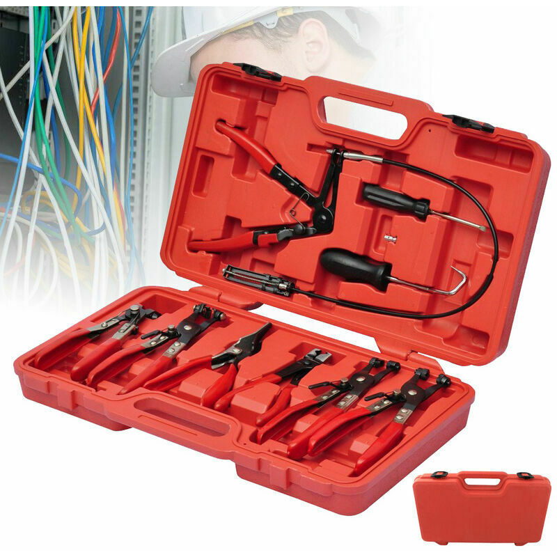 Descrizione del prodotto Per il montaggio e lo smontaggio di fascette speciali su sistemi liquidi, sistemi di tubazioni, fascette stringitubo, fascette piatte e fascette elastiche. Lavorare in modo rapido ed efficace in ambienti difficili raggiungere punti senza grande sforzo e con buona precisione. Le impugnature gommate assicurano la giusta presa e quindi una buona trasmissione della potenza. Dati tecnici 1 x pinza speciale per fascette stringitubo con cavo Bowden Per il montaggio e lo smontaggio di tutte le fascette elastiche flessibili e autoserranti (18-54 mm). Ideale per lavorare in luoghi stretti e difficili da raggiungere. 1 x pinza per fascette stringitubo per fascette stringitubo CLIC e CLIC-R (circa 180 mm) per aprire e chiudere il fascette stringitubo 1 x pinza per fascette stringitubo con "+" Registrazione 1 x pinza per fascette stringitubo con "U" Supporto 1 x pinza per rimozione/distacco del tubo (diametro 4 - 13 mm) 1 x pinza per fascetta a molla piatta 1 x pinza ad