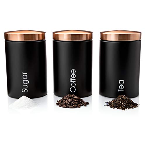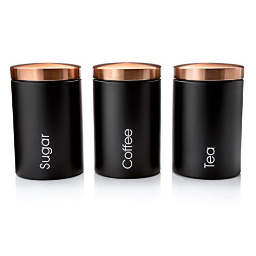 Pioppo Aspen - Set di 3 contenitori da cucina in metallo, con coperchio in acciaio inox rame, per conservare tè, caffè e zucchero, dimensioni 11 x 11 x 17 cm