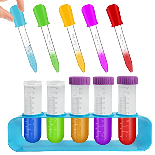 Kit scientifici per bambini: Otterrete il kit esperimenti scientifici per bambini include 5 grandi provette per bambini, 5 contagocce di liquido in silicone (rosso, blu, giallo, verde, viola), 1 rack per provette. 11 pezzi in totale abbastanza per soddisfare le esigenze dei vostri bambini per il test di scienza, esercitare l'abilità pratica del vostro bambino mentre hanno esperimento divertente.