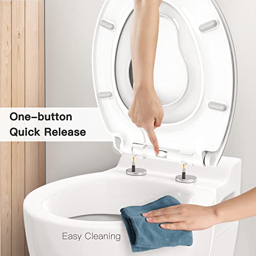 Sedile WC con chiusura morbida: da un lato, la funzione di chiusura morbida integrata consente al nostro sedile WC di chiudersi delicatamente e silenziosamente, evitando che il rumore sia per la tua famiglia, soprattutto di notte. D'altra parte, non c'è bisogno di preoccuparsi che il sedile improvviso si sbatte per pizzicare le dita del bambino (nota: il seggiolino per WC per bambini non ha una funzione di chiusura morbida)