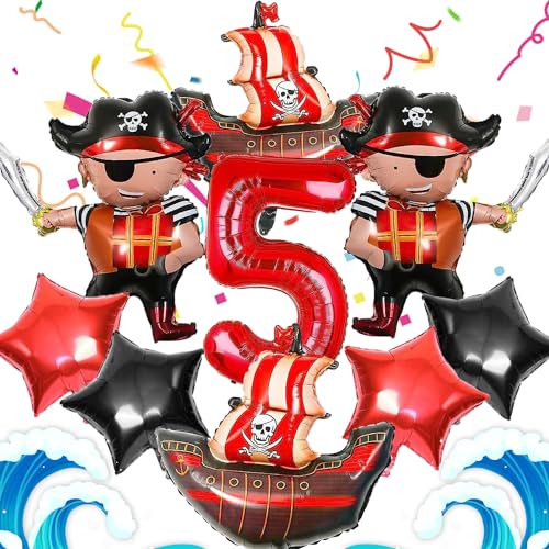 【Set di compleanno per bambini decorazione pirata】1x palloncino foil "5" digitale, 4x palloncini foil a stella, 2x pirata palloncini foil compleanno, 2 x nave pirata palloncini foil. Fai una festa meravigliosa con le nostre decorazioni per il compleanno dei pirati!