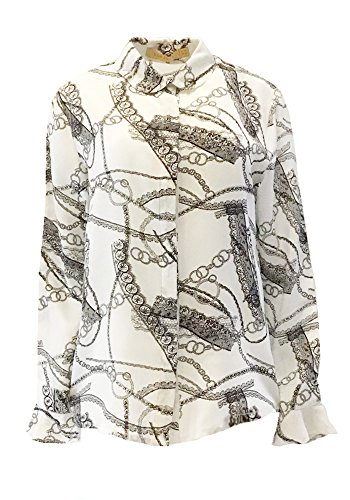 ANA PIRES MILANO Camicia Pietra, 100% Seta, Fantasia Bianca e Nero, Collo Tondo, Bianca, Taglia 44