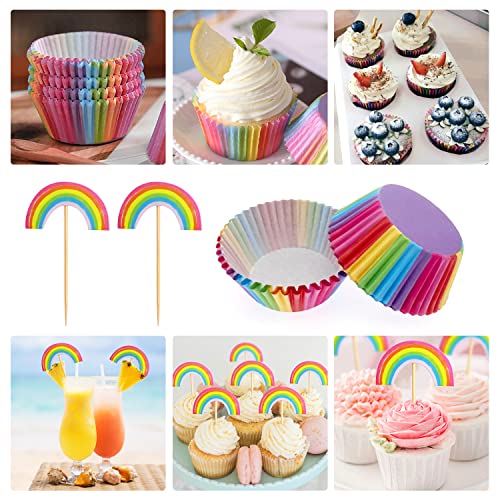Qualità eccellente: i bicchieri di carta per torte arcobaleno sono realizzati in carta oliata. Sono sicuri, atossici e insapori, facili da staccare dallo stampo, non si deformano, resistenti all'olio e antiaderenti, non sbiadiscono e non contaminano gli alimenti. Si può utilizzare con fiducia. Topper per cupcake arcobaleno in carta e bastoncino per decorare le torte.