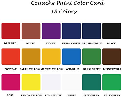 18 colori x 30 ml Guazzo - rosso intenso, ocra, viola, oltremare, blu prussiano, nero, ponceau, giallo terra, giallo midlum, blu acido, verde erba, bruciato, rosa, giallo limone, bianco titanio, bianco, verde giada, verde pallido. Bella e pratica selezione di colori con contenuto lager, perfetta per la pratica quotidiana.