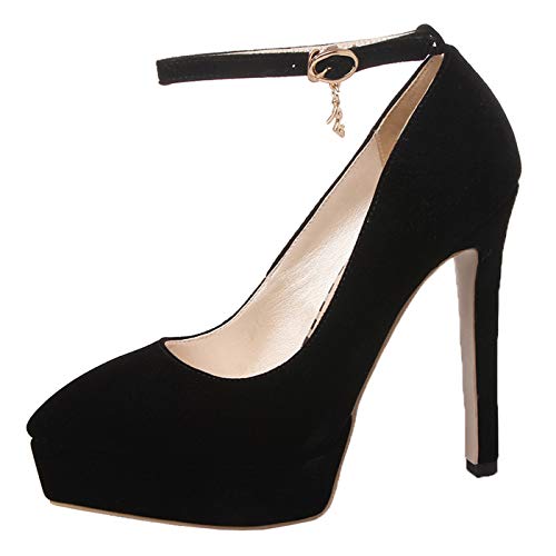 PIXIEFOOT Scarpe Decolte Donna con Tacco a Spillo Alto Plateau Cinturino alla Caviglia Pointed Toe (35 EU, Nero)