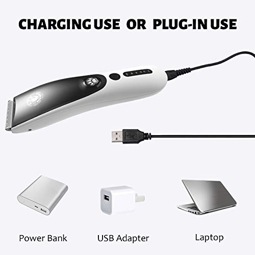 Alimentatore a lungo termine - la batteria ricaricabile agli ioni di litio ricaricabile da 2000 mAh per clipper per animali domestici, può 5 ore di cordless funzionante dopo 3 ore completamente cariche, e il rimanente potenza della batteria mostrerà dagli indicatori, il 20%, il 40%, il 60%, 80%, 100%. USB ricaricabile, carica il tuo clipper per cani tramite una banca di potenza, laptop, desktop, adattatore di alimentazione 5V, facile da usare ..
