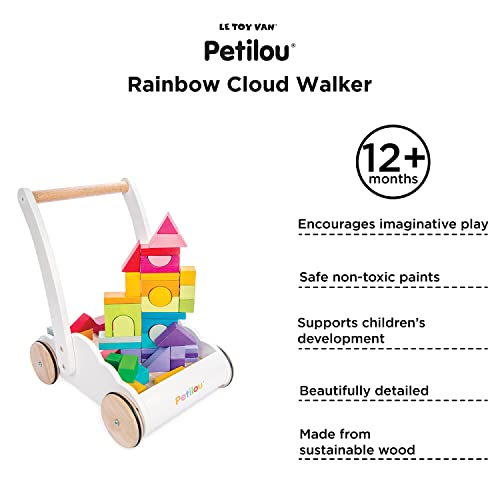Le Toy Van - PL102 - Gioco educativo carrello primi passi multiattività per bambini, 1 anno, con scomparto 45 blocchi in legno, Montessori, girello, ecologico, riconoscimento forme e colori, Petilou