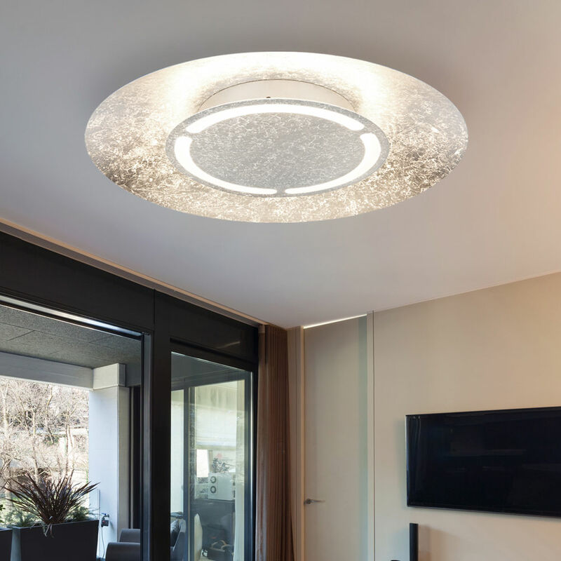 Descrizione Questa moderna plafoniera della serie di lampade Matteo è realizzata in metallo e si caratterizza per il suo aspetto particolare . Con un diametro di 50 cm, la lampada in metallo argentato ha le dimensioni perfette per essere utilizzata in molti modi. Ha una sorgente luminosa a LED con una durata di 20.000 ore, che brilla con 1600 lumen e fornisce una piacevole luce calda con una temperatura di colore di 3000K. Rispetto alle luci normali, i faretti a LED consumano una quantità minima di elettricità e hanno un consumo persino inferiore rispetto alle luci a risparmio energetico. Questo protegge l'ambiente e il tuo portafoglio. È inclusa una sorgente luminosa a LED di alta qualità a risparmio energetico. Dettagli lampada • tipo di lampada: plafoniera• materiale: metallo• colore: argento metallizzato• paralume: bianco patinato • diametro x altezza in cm: 50 x 8,5 • lampadine: 1x LED• lampadine incluse: si• lampadine di potenza: 1x 24 watt• flusso luminoso: 1x 1600 lumen